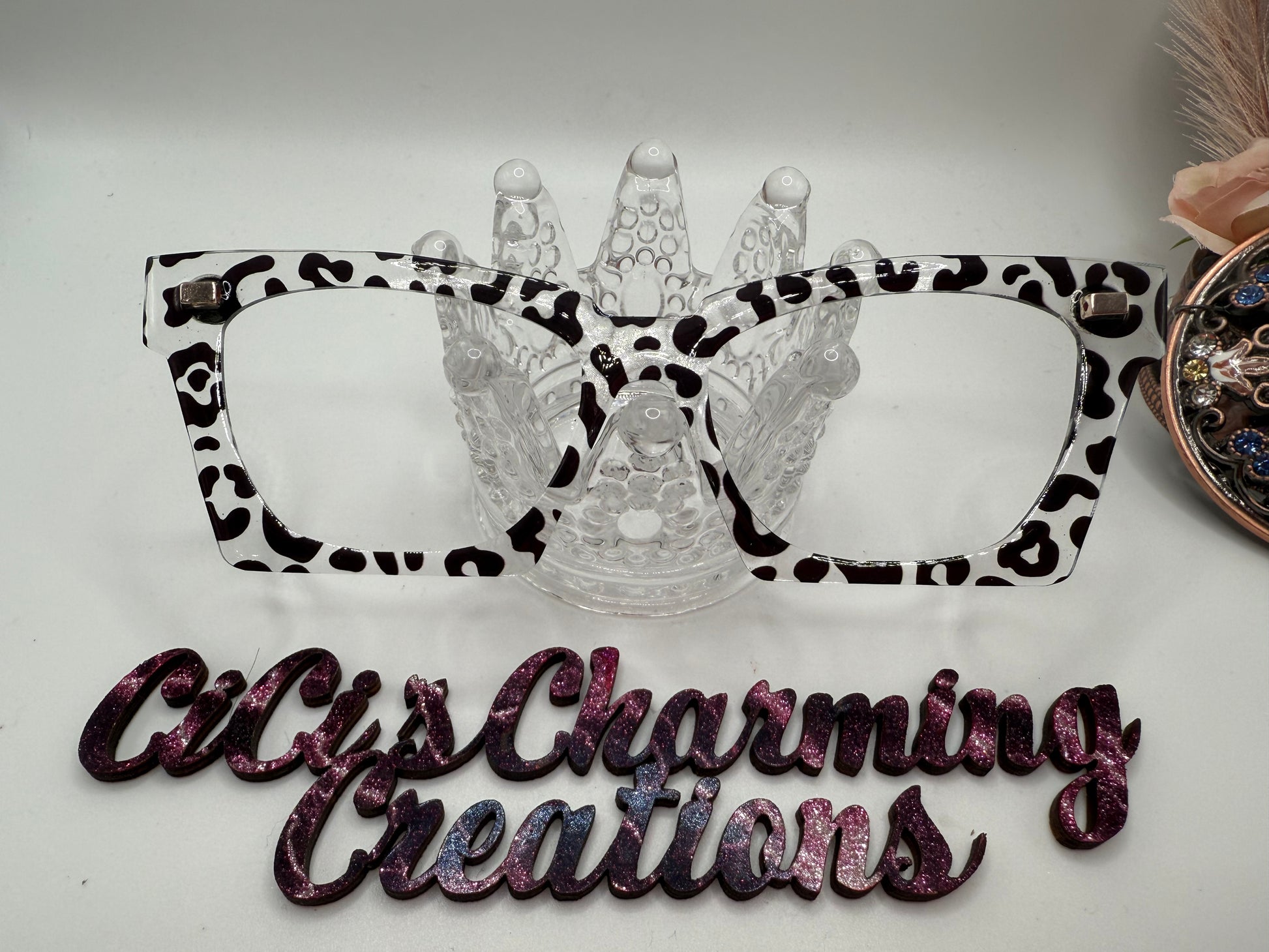 Black Animal Print. Shown on translucent with resin finish and embellishments.