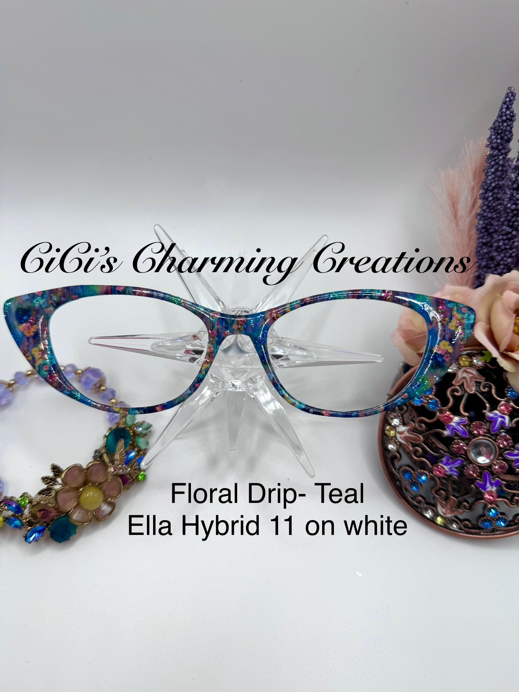 Shown on white with and without flower embellishments. Shown with resin.
