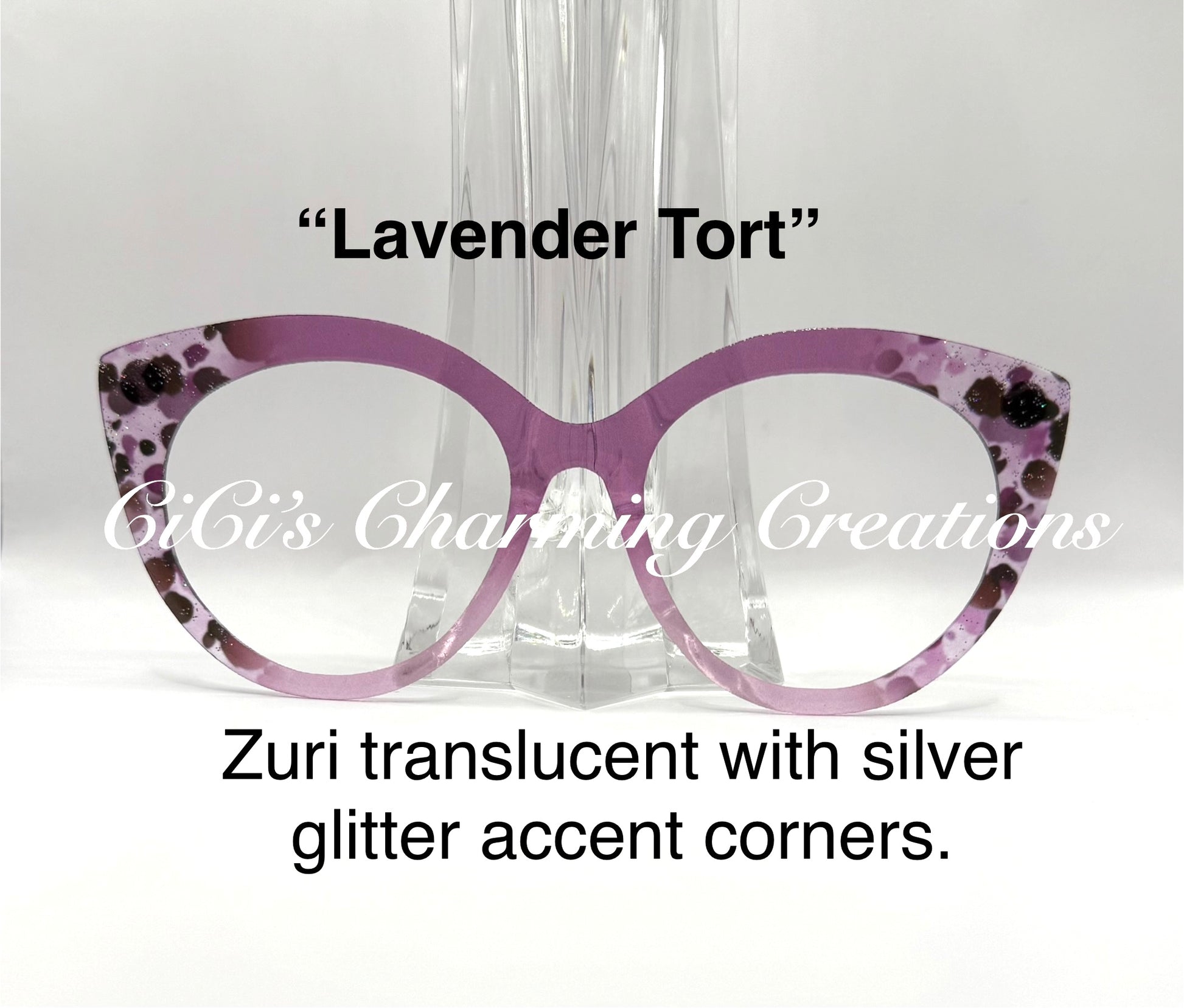 Shades of lavender with tort sides. Shown on translucent with touches of glitter and resin.