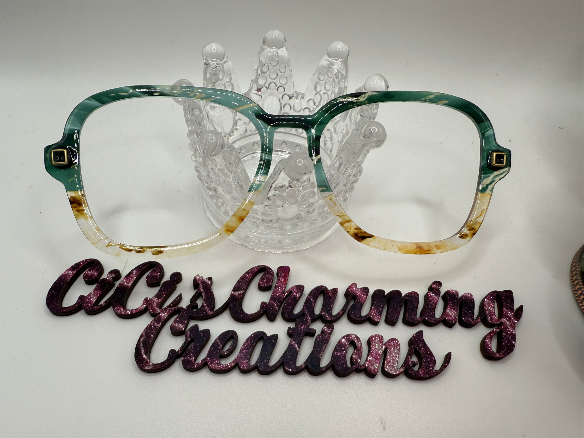 Dark teal green marble to beige brown marble. Shown with embellishments on translucent with resin. Embellishments will vary. X out of stock. Put in comments what kind of embellishment you would like (Ex, rhinestone, butterfly, bow, heart, star, etc.)